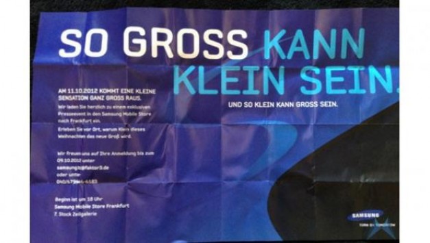 H πρόσκληση που έστειλε η Samsung στον γερμανικό Τύπο είχε επικεφαλίδα «τόσο μεγάλο που μπορεί να είναι μικρό και τόσο μικρό που μπορεί να είναι μεγάλο», η οποία μας προετοιμάζει για την παρουσίαση μιας μικρότερης έκδοσης του Samsung Galaxy S3 στις 11 Οκτωβρίου στο κατάστημα της Samsung Mobile στη Φρανκφούρτη.